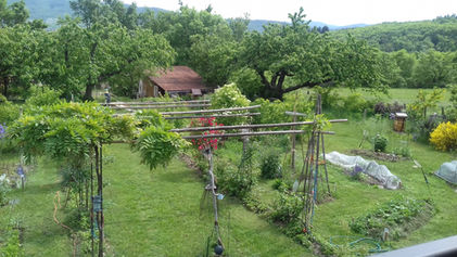 Aussi, il y a la présence massive de plantain - quelques pieds sont utiles contre les piqûres d'insectes, bien sûr, mais un champ entier ? - et d'Erodium à bec de grue, que Brigitte tente de circonscrire pour installer d'autres plantes. Beaucoup de sauvageonnes prennent leurs aises comme les genêts à balai à travers lesquels les poules se frayent un chemin, les achillées et origans par milliers qui font couvre-sol dans le potager-mandala, les boutons d'or, sauges sauvages, coquelicots, bleuets, le lierre au pied des chênes, la vigne sauvage qui escalade un frêne qui en devient un arbre à raisin ! Pour la récolte, il faut sortir l'échelle ...